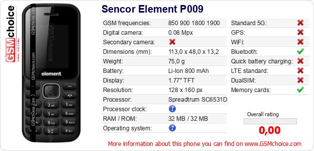 Do you have your website? Do you want to insert information about basic phone data of Sencor Element P009 somewhere? It is very easy. You can download the picture, or copy and paste the code below on the page:Pasting this code will display the following image: