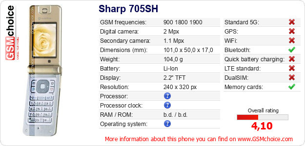 Do you have your website? Do you want to insert information about basic phone data of Sharp 705SH somewhere? It is very easy. You can download the picture, or copy and paste the code below on the page:Pasting this code will display the following image: