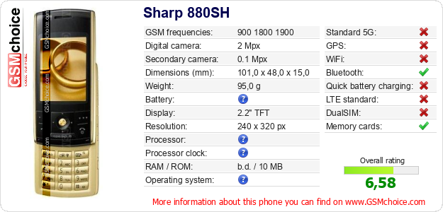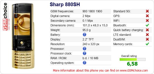 Do you have your website? Do you want to insert information about basic phone data of Sharp 880SH somewhere? It is very easy. You can download the picture, or copy and paste the code below on the page:Pasting this code will display the following image: