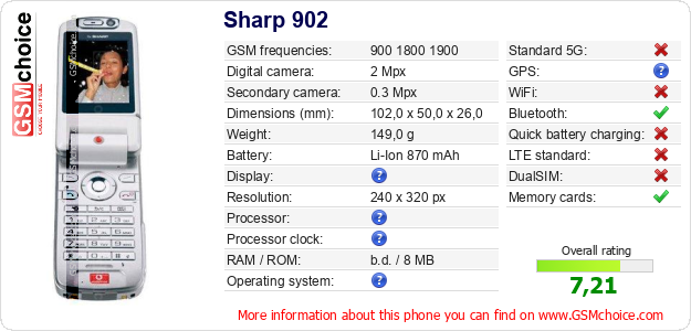 Do you have your website? Do you want to insert information about basic phone data of Sharp 902 somewhere? It is very easy. You can download the picture, or copy and paste the code below on the page:Pasting this code will display the following image: