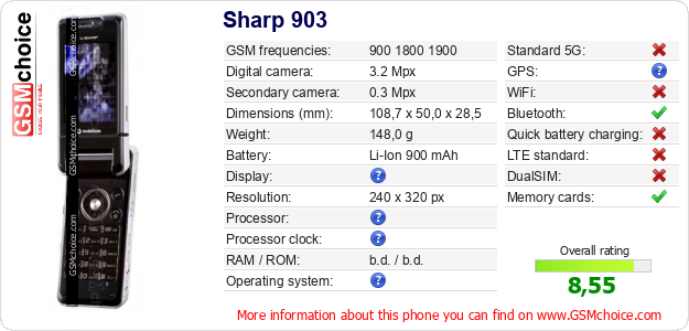 Do you have your website? Do you want to insert information about basic phone data of Sharp 903 somewhere? It is very easy. You can download the picture, or copy and paste the code below on the page:Pasting this code will display the following image: