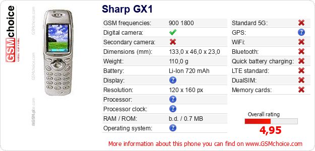 Do you have your website? Do you want to insert information about basic phone data of Sharp GX1 somewhere? It is very easy. You can download the picture, or copy and paste the code below on the page:Pasting this code will display the following image: