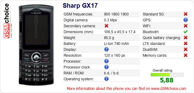 Do you have your website? Do you want to insert information about basic phone data of Sharp GX17 somewhere? It is very easy. You can download the picture, or copy and paste the code below on the page:Pasting this code will display the following image:
