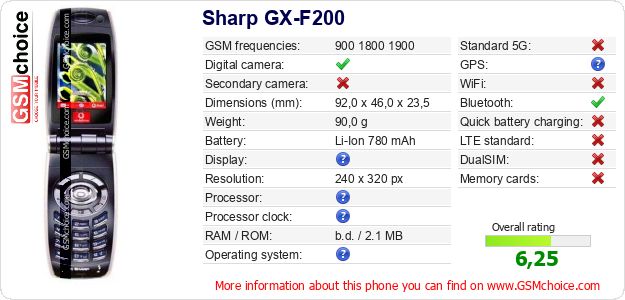 Do you have your website? Do you want to insert information about basic phone data of Sharp GX-F200 somewhere? It is very easy. You can download the picture, or copy and paste the code below on the page:Pasting this code will display the following image: