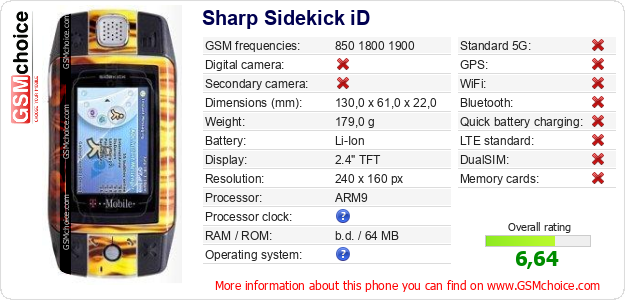 Do you have your website? Do you want to insert information about basic phone data of Sharp Sidekick iD somewhere? It is very easy. You can download the picture, or copy and paste the code below on the page:Pasting this code will display the following image: