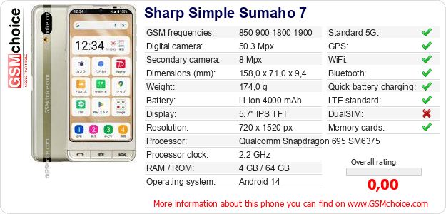 Do you have your website? Do you want to insert information about basic phone data of Sharp Simple Sumaho 7 somewhere? It is very easy. You can download the picture, or copy and paste the code below on the page:Pasting this code will display the following image: