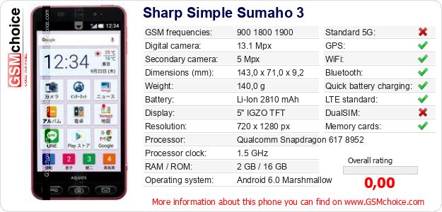 Do you have your website? Do you want to insert information about basic phone data of Sharp Simple Sumaho 3 somewhere? It is very easy. You can download the picture, or copy and paste the code below on the page:Pasting this code will display the following image: