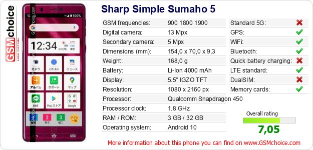 Do you have your website? Do you want to insert information about basic phone data of Sharp Simple Sumaho 5 somewhere? It is very easy. You can download the picture, or copy and paste the code below on the page:Pasting this code will display the following image: