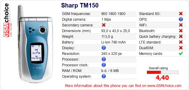 Do you have your website? Do you want to insert information about basic phone data of Sharp TM150 somewhere? It is very easy. You can download the picture, or copy and paste the code below on the page:Pasting this code will display the following image: