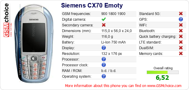 Do you have your website? Do you want to insert information about basic phone data of Siemens CX70 Emoty somewhere? It is very easy. You can download the picture, or copy and paste the code below on the page:Pasting this code will display the following image: