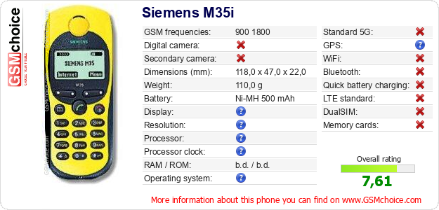 Do you have your website? Do you want to insert information about basic phone data of Siemens M35i somewhere? It is very easy. You can download the picture, or copy and paste the code below on the page:Pasting this code will display the following image: