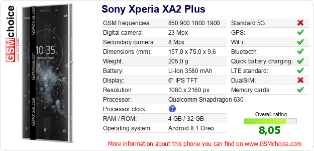 Do you have your website? Do you want to insert information about basic phone data of Sony Xperia XA2 Plus somewhere? It is very easy. You can download the picture, or copy and paste the code below on the page:Pasting this code will display the following image: