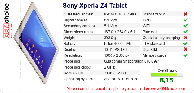 Do you have your website? Do you want to insert information about basic phone data of Sony Xperia Z4 Tablet somewhere? It is very easy. You can download the picture, or copy and paste the code below on the page:Pasting this code will display the following image: