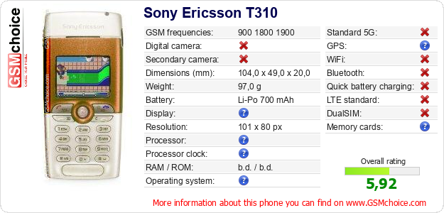 Do you have your website? Do you want to insert information about basic phone data of Sony Ericsson T310 somewhere? It is very easy. You can download the picture, or copy and paste the code below on the page:Pasting this code will display the following image:
