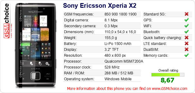 Do you have your website? Do you want to insert information about basic phone data of Sony Ericsson Xperia X2 somewhere? It is very easy. You can download the picture, or copy and paste the code below on the page:Pasting this code will display the following image:
