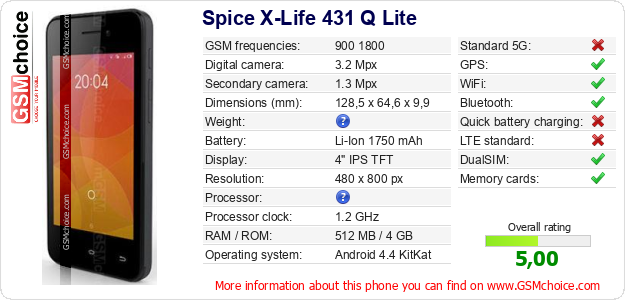 Do you have your website? Do you want to insert information about basic phone data of Spice X-Life 431 Q Lite somewhere? It is very easy. You can download the picture, or copy and paste the code below on the page:Pasting this code will display the following image: