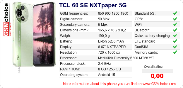 Do you have your website? Do you want to insert information about basic phone data of TCL 60 SE NXTpaper 5G somewhere? It is very easy. You can download the picture, or copy and paste the code below on the page:Pasting this code will display the following image: