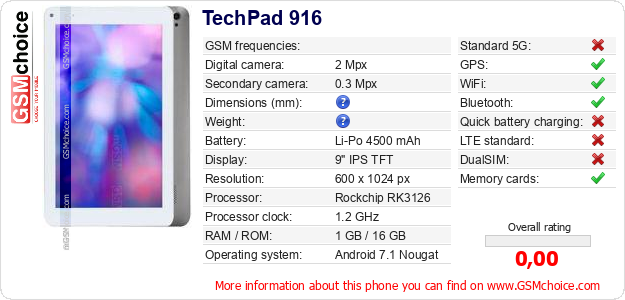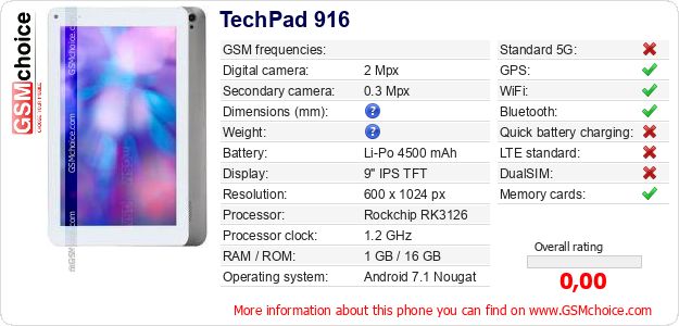 Do you have your website? Do you want to insert information about basic phone data of TechPad 916 somewhere? It is very easy. You can download the picture, or copy and paste the code below on the page:Pasting this code will display the following image: