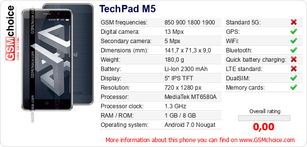 Do you have your website? Do you want to insert information about basic phone data of TechPad M5 somewhere? It is very easy. You can download the picture, or copy and paste the code below on the page:Pasting this code will display the following image:
