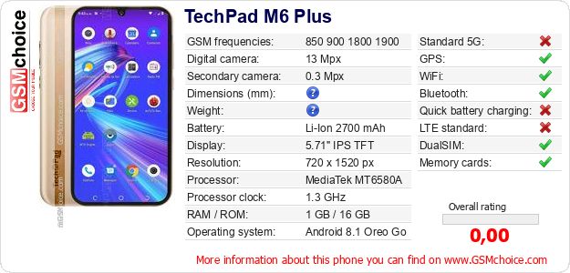 Do you have your website? Do you want to insert information about basic phone data of TechPad M6 Plus somewhere? It is very easy. You can download the picture, or copy and paste the code below on the page:Pasting this code will display the following image: