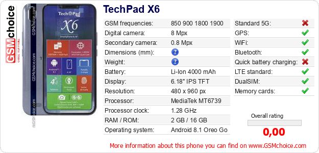Do you have your website? Do you want to insert information about basic phone data of TechPad X6 somewhere? It is very easy. You can download the picture, or copy and paste the code below on the page:Pasting this code will display the following image:
