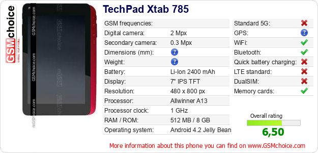 Do you have your website? Do you want to insert information about basic phone data of TechPad Xtab 785 somewhere? It is very easy. You can download the picture, or copy and paste the code below on the page:Pasting this code will display the following image: