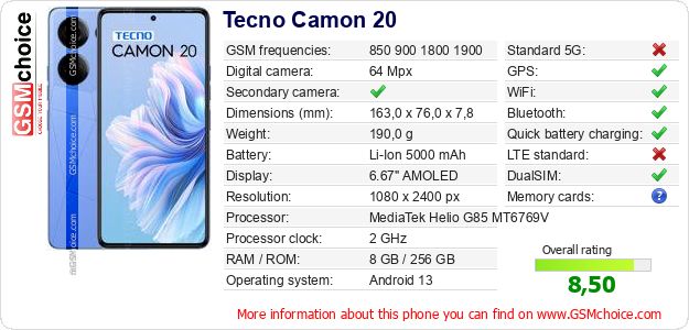 Do you have your website? Do you want to insert information about basic phone data of Tecno Camon 20 somewhere? It is very easy. You can download the picture, or copy and paste the code below on the page:Pasting this code will display the following image: