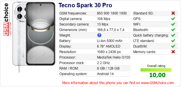 Do you have your website? Do you want to insert information about basic phone data of Tecno Spark 30 Pro somewhere? It is very easy. You can download the picture, or copy and paste the code below on the page:Pasting this code will display the following image: