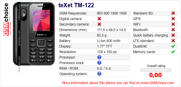 Do you have your website? Do you want to insert information about basic phone data of teXet TM-122 somewhere? It is very easy. You can download the picture, or copy and paste the code below on the page:Pasting this code will display the following image:
