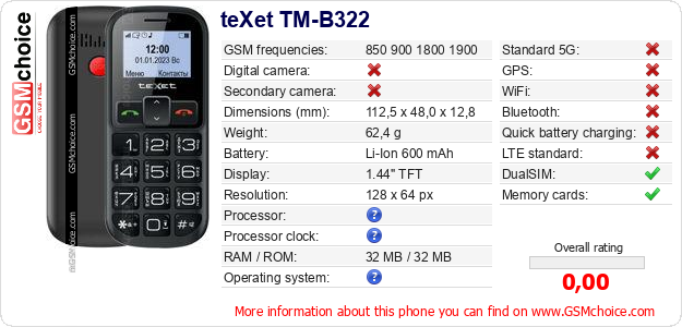 Do you have your website? Do you want to insert information about basic phone data of teXet TM-B322 somewhere? It is very easy. You can download the picture, or copy and paste the code below on the page:Pasting this code will display the following image: