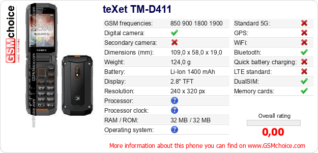 Do you have your website? Do you want to insert information about basic phone data of teXet TM-D411 somewhere? It is very easy. You can download the picture, or copy and paste the code below on the page:Pasting this code will display the following image: