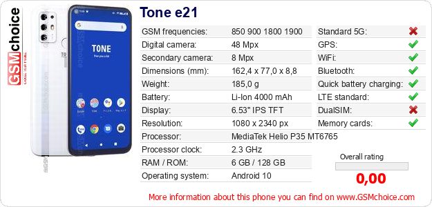 Do you have your website? Do you want to insert information about basic phone data of Tone e21 somewhere? It is very easy. You can download the picture, or copy and paste the code below on the page:Pasting this code will display the following image: