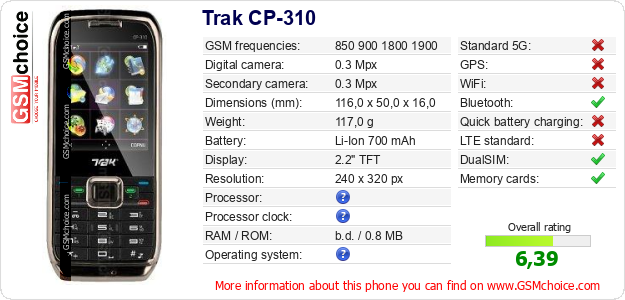 Do you have your website? Do you want to insert information about basic phone data of Trak CP-310 somewhere? It is very easy. You can download the picture, or copy and paste the code below on the page:Pasting this code will display the following image: