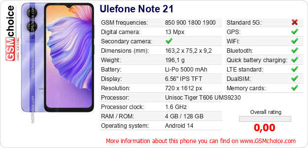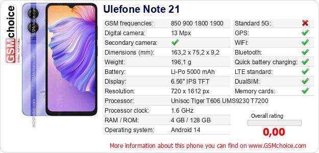 Do you have your website? Do you want to insert information about basic phone data of Ulefone Note 21 somewhere? It is very easy. You can download the picture, or copy and paste the code below on the page:Pasting this code will display the following image: