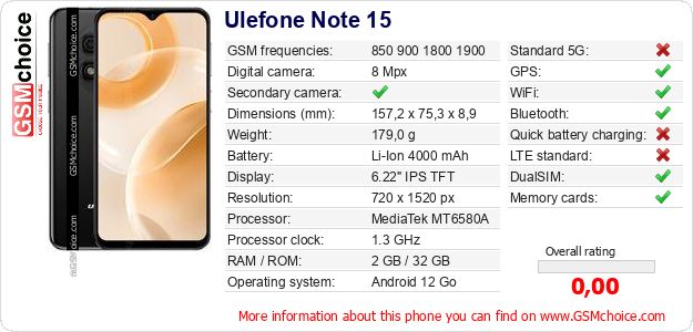 Do you have your website? Do you want to insert information about basic phone data of Ulefone Note 15 somewhere? It is very easy. You can download the picture, or copy and paste the code below on the page:Pasting this code will display the following image: