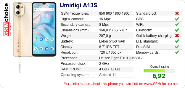 Do you have your website? Do you want to insert information about basic phone data of Umidigi A13S somewhere? It is very easy. You can download the picture, or copy and paste the code below on the page:Pasting this code will display the following image: