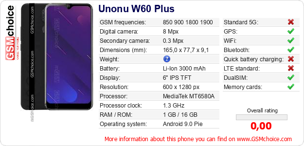 Do you have your website? Do you want to insert information about basic phone data of Unonu W60 Plus somewhere? It is very easy. You can download the picture, or copy and paste the code below on the page:Pasting this code will display the following image: