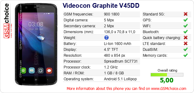 Do you have your website? Do you want to insert information about basic phone data of Videocon Graphite V45DD somewhere? It is very easy. You can download the picture, or copy and paste the code below on the page:Pasting this code will display the following image: