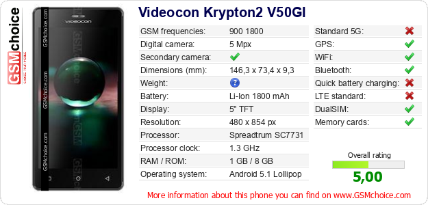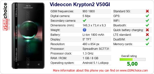 Do you have your website? Do you want to insert information about basic phone data of Videocon Krypton2 V50GI somewhere? It is very easy. You can download the picture, or copy and paste the code below on the page:Pasting this code will display the following image: