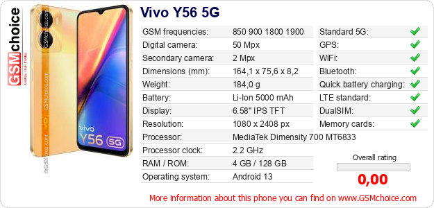 Do you have your website? Do you want to insert information about basic phone data of Vivo Y56 5G somewhere? It is very easy. You can download the picture, or copy and paste the code below on the page:Pasting this code will display the following image: