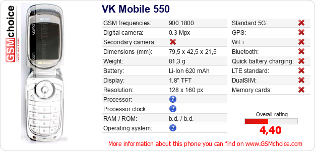 Do you have your website? Do you want to insert information about basic phone data of VK Mobile 550 somewhere? It is very easy. You can download the picture, or copy and paste the code below on the page:Pasting this code will display the following image:
