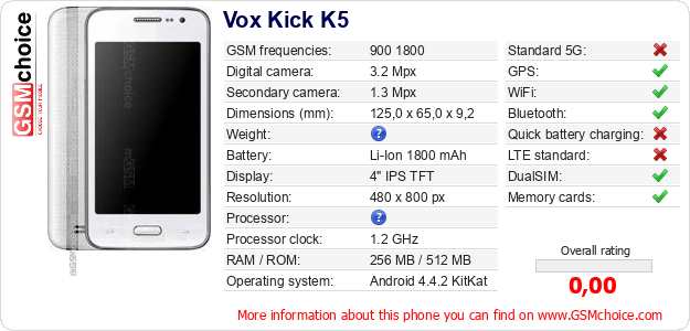 Do you have your website? Do you want to insert information about basic phone data of Vox Kick K5 somewhere? It is very easy. You can download the picture, or copy and paste the code below on the page:Pasting this code will display the following image: