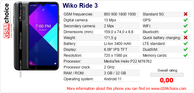 Do you have your website? Do you want to insert information about basic phone data of Wiko Ride 3 somewhere? It is very easy. You can download the picture, or copy and paste the code below on the page:Pasting this code will display the following image: