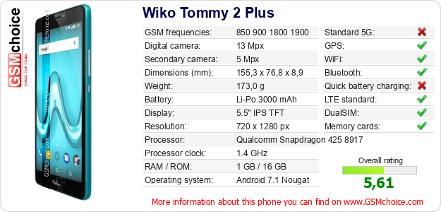 Do you have your website? Do you want to insert information about basic phone data of Wiko Tommy 2 Plus somewhere? It is very easy. You can download the picture, or copy and paste the code below on the page:Pasting this code will display the following image: