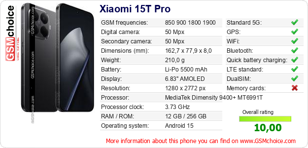 Do you have your website? Do you want to insert information about basic phone data of Xiaomi 15T Pro somewhere? It is very easy. You can download the picture, or copy and paste the code below on the page:Pasting this code will display the following image:
