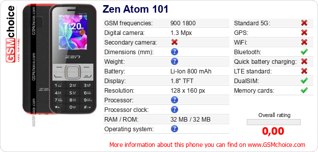 Do you have your website? Do you want to insert information about basic phone data of Zen Atom 101 somewhere? It is very easy. You can download the picture, or copy and paste the code below on the page:Pasting this code will display the following image: