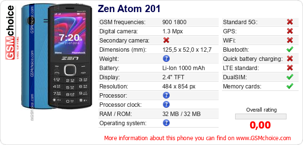 Do you have your website? Do you want to insert information about basic phone data of Zen Atom 201 somewhere? It is very easy. You can download the picture, or copy and paste the code below on the page:Pasting this code will display the following image:
