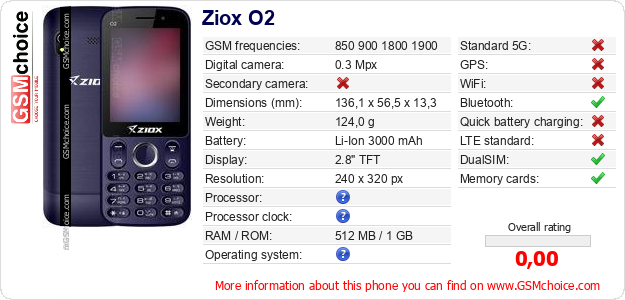 Do you have your website? Do you want to insert information about basic phone data of Ziox O2 somewhere? It is very easy. You can download the picture, or copy and paste the code below on the page:Pasting this code will display the following image:
