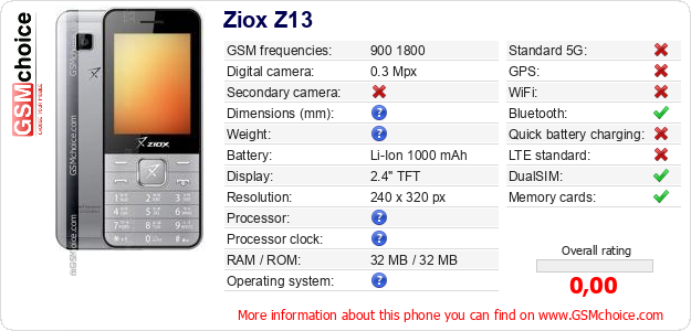 Do you have your website? Do you want to insert information about basic phone data of Ziox Z13 somewhere? It is very easy. You can download the picture, or copy and paste the code below on the page:Pasting this code will display the following image: