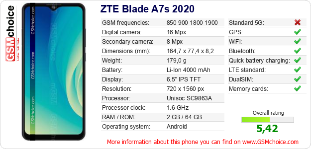 Do you have your website? Do you want to insert information about basic phone data of ZTE Blade A7s 2020 somewhere? It is very easy. You can download the picture, or copy and paste the code below on the page:Pasting this code will display the following image: